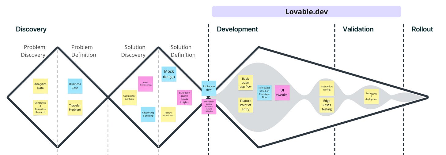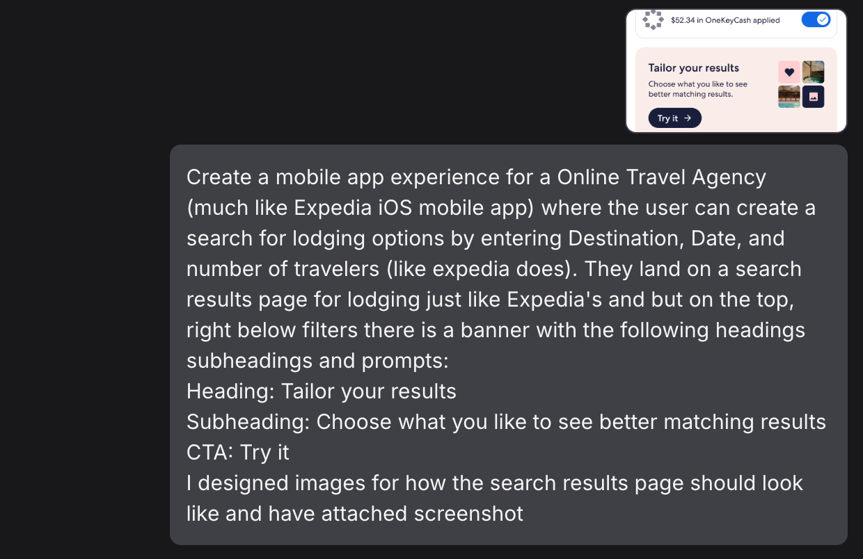 What made the process of proof-of-concept creation for me exceptionally fast was the intense preparation I and my teammate had done leading up to it. From having the traveler problem and business use case ready to having our goals and priorities of the feature clearly defined, enabled me to write prompts that were comprehensive, unambiguous, contextually sound, and aligned to a design and product experience vision. Having some (Figma) design screens handy cushioned my prompts with visual references wherever needed.
