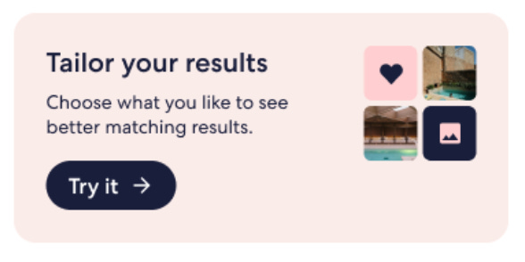 Prompt: When the user lands on a search results page for lodging add a banner on the top of the results list, right below filters, with the following headings subheadings and prompts: Heading: Tailor your results Subheading: Choose what you like to see better matching results CTA: Try it I designed images for how the banner should look like and have attached images.