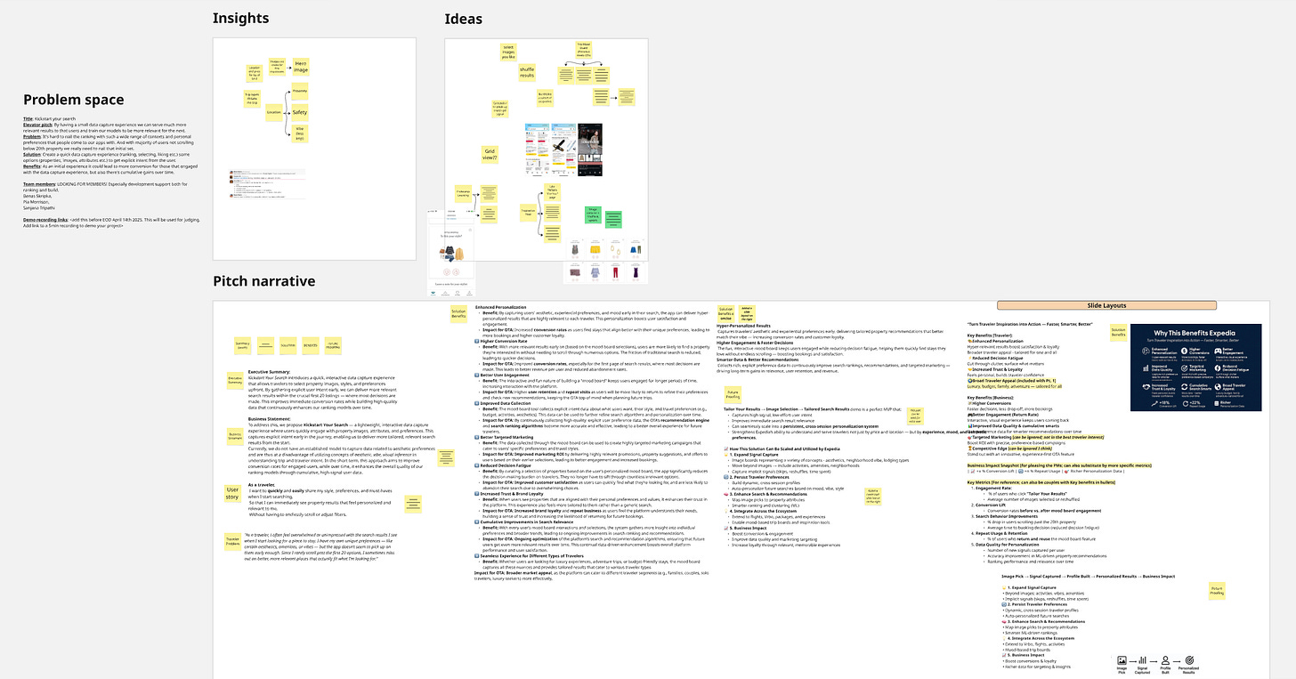 My hackathon project, Kickstart Your Search, introduces a quick, interactive data capture experience that allows travelers, shopping for lodging on their Expedia mobile app, to select property images, styles, and preferences upfront. This captures implicit intent early in the journey, enabling us to deliver more tailored, relevant search results from the start.